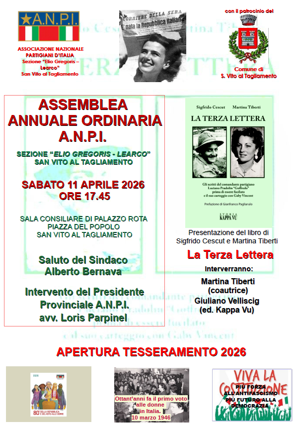 Presentazione dell’emozionante libro di Martina Tiberti e Sigfrido Cescut “La terza lettera. Gli scritti del comandante partigiano Luciano Pradolin “Goffredo” prima di essere fucilato e il suo carteggio con Gaby Vincent”. In occasione dell’assemblea ordinaria della Sezione ANPI “Elio Gregoris – Learco” di San Vito al Tagliamento presso la Sala consiliare di Palazzo Rota in Piazza del Popolo. Oltre all’autrice e a Giuliano Velliscig, interverranno Alberto Bernava, sindaco di San Vito, e Loris Parpinel, presidente dell’ANPI provinciale.