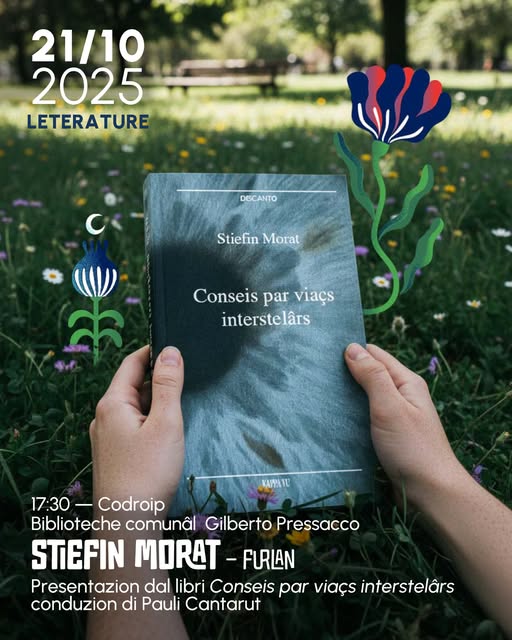 Martars 21 a Codroip li de biblioteche cognossarin finalmentri il gnûf lavôr poetic di Stiefin Morat “Conseis par viacs interstelârs”. Cui contribûts di Pauli Cantarut e Sandri Carrozzo! Us spietìn!
