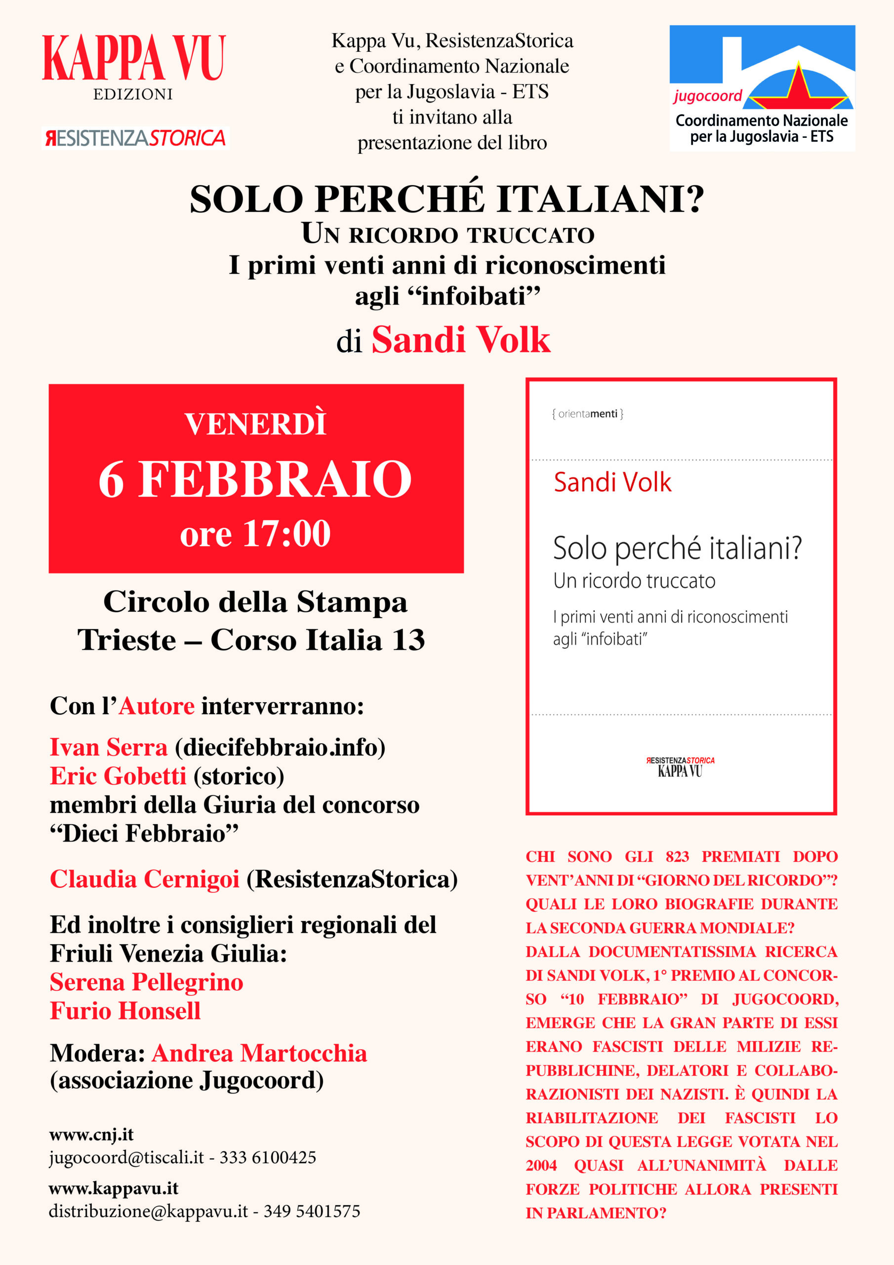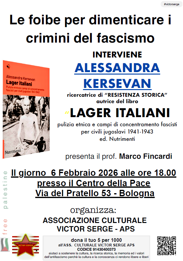 All’Auditorium comunale “Casa della cultura” di Ronchi dei Legionari (GO) seconda presentazione del nuovo libro di Alessandra Kersevan; introduce e modera Marco Puppini. Evento inserito nella rassegna “Noi e la storia. Sguardi e racconti da un passato in comune”, promossa dal Comune di Ronchi dei Legionari, da Ronchi Cultura e dalla Biblioteca comunale “Sandro Pertini”.