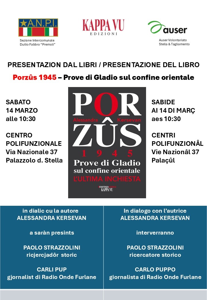 Presentazione del nuovo libro di Alessandra Kersevan a cura dell’ANPI sezione di Palazzolo e Auser, con la partecipazione dell’Autrice, del ricercatore storico Paolo Strazzolini e del giornalista Carlo Puppo di Radio Onde Furlane. Sabato 14 alle 10:30 al Centro Polifunzionale di Palazzolo dello Stella.
