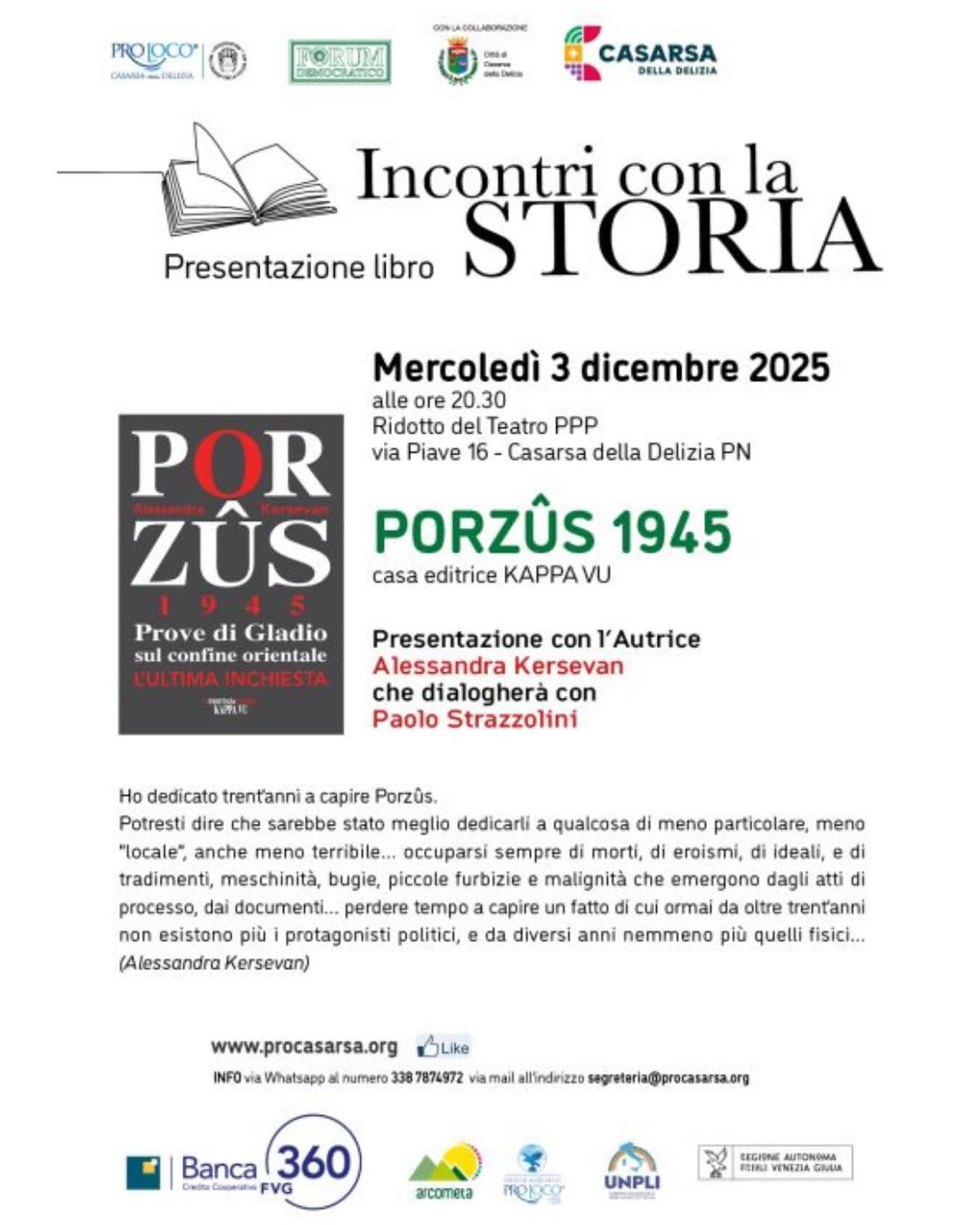Per “Incontri con la storia”, il nuovissimo e atteso “Porzûs 1945. Prove di Gladio sul confine orientale” di Alessandra Kersevan verrà presentato a Casarsa presso il ridotto del teatro Pasolini, mercoledì 3 alle 20:30. Con l’autrice dialogherà Paolo Strazzolini. Evento promosso da Pro Casarsa, Forum Democratico e Comune dì Casarsa.