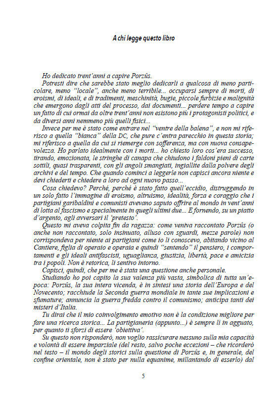 Gli storici e i politici italiani in tutto il dopoguerra hanno dato per certa la versione dei fatti sancita dai giudici del tempo: a Porzûs un gruppo di gappisti comunisti “filotitini” e traditori ha ucciso un gruppo di partigiani “bianchi” difensori del confine orientale d’Italia. Ma le cose sono andate proprio così? Purtroppo anche il mondo antifascista non ha messo sostanzialmente in discussione questa narrazione, forse costretto sulla difensiva in tutto il dopoguerra da un rinato mondo antipartigiano particolarmente aggressivo e dotato di mezzi potenti di propaganda e persuasione. E, soprattutto dagli anni Novanta, tanti politici di sinistra e istituti storici hanno lasciato il campo ai Pirina, cioè alla versione neofascista delle vicende resistenziali, e ai Pansa, cioè alla versione degli antifascisti un po’ pentiti di esserlo stati, ovvero di aver fatto la Resistenza con i comunisti.