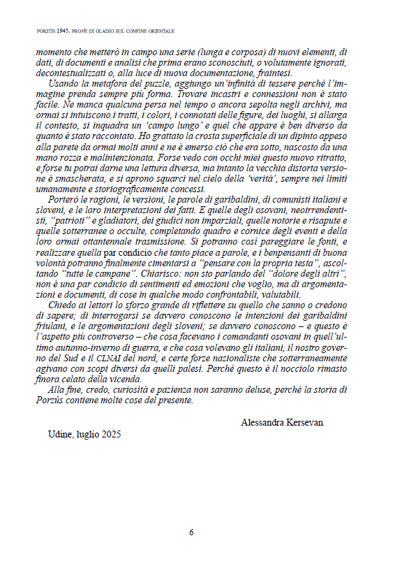 La mia inchiesta storica parte dalla consapevolezza che di fronte alla propaganda “eterna” intorno alla vicenda di Porzûs era necessario andare “a vedere le carte”, verificare tutti i passaggi, dallo svolgimento dei fatti al comportamento di tutti i soggetti in campo. Ciò che ne è emerso è qualcosa di completamente diverso da quanto narrato dal mainstream giornalistico e anche storiografico. Il re ora è nudo. Demistificare la narrazione di Porzûs è emblematicamente importante per l’oggi. Non è mai tardi per ricominciare una strenua battaglia storica. Ce n’è bisogno. Lo vediamo ormai ogni giorno. (Alessandra Kersevan)